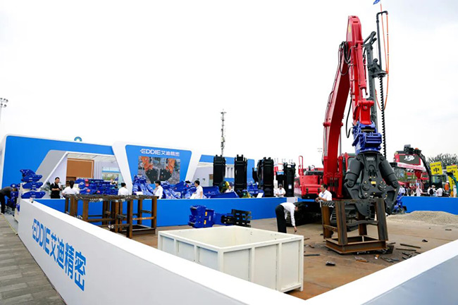 This area presented the full range of hydraulic breakers, double-cylinder shear cutters, quick couplers, vibratory rammers, scrap grapples, and eagle-nose shears. A dynamic demonstration zone highlighted equipment efficiency, leveraging the 10-second quick-change feature for high-performance operations.