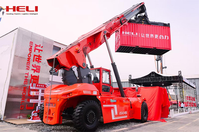 New-energy forklifts spearhead green transformation. Among HELI’s star exhibits, the 55-ton lithium battery forklift made its debut, marking a major milestone in large-tonnage lithium technology and underscoring HELI’s leadership in sustainable heavy-duty material handling solutions.